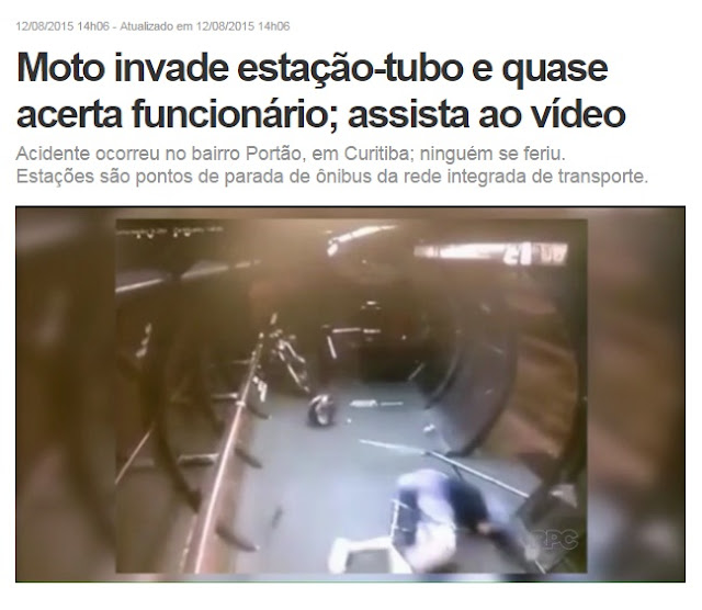 Reportagem e vídeo: http://g1.globo.com/pr/parana/noticia/2015/08/moto-invade-estacao-tubo-e-quase-acerta-funcionario-assista-ao-video.htmlAssista o vídeo na reportagem do g1 neste link.